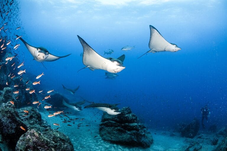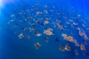 Land’s End is where the Pacific Ocean meets the Sea of Cortez, creating an unforgettable dive site. Expect playful encounters with a resident sea lion colony, schools of cow-nose rays, baitfish, snappers and more. You’ll also find the remains of the “Nürnberg” shipwreck sitting around 40 feet.